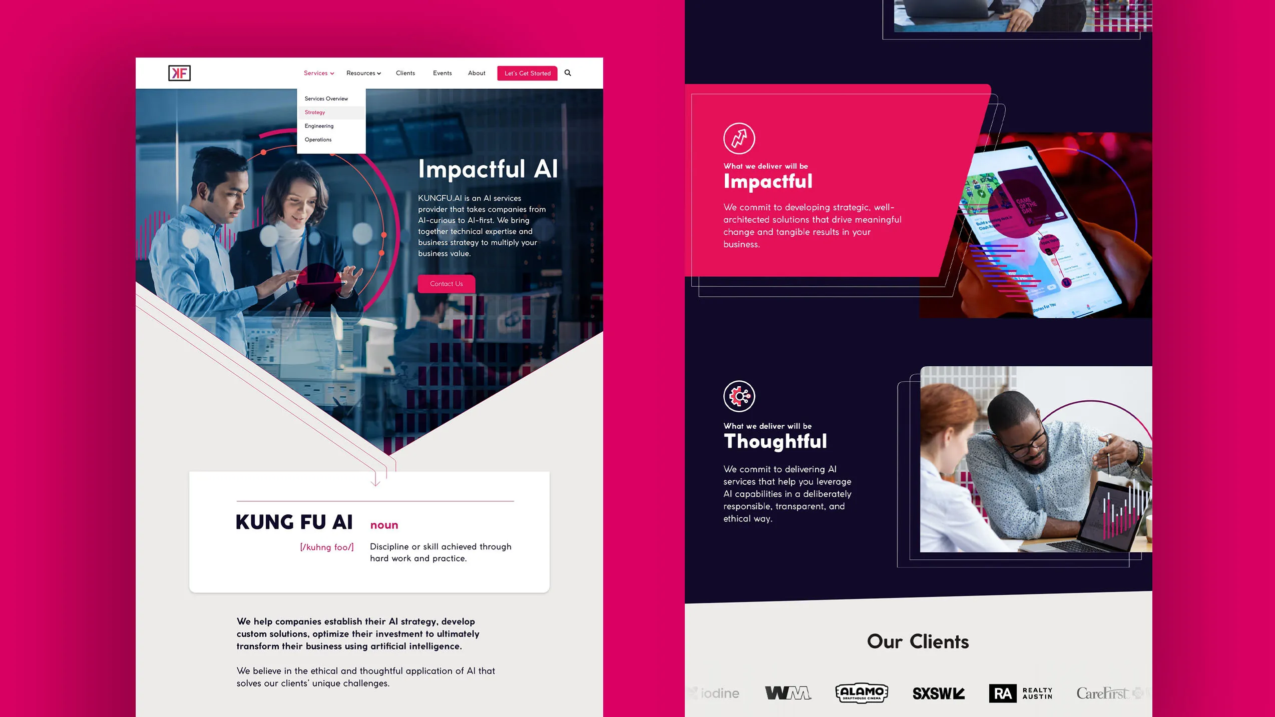 KUNGFU’s website is content-driven and rich with resources including case studies, demos, whitepapers, and more. From their AI for Good initiative to in-depth overviews of their process and strategy we created designs that highlight their innovative process and forward-thinking AI strategies.